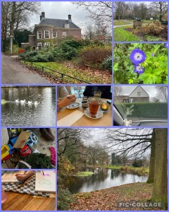 De sneeuwwitte ganzen in contrast met de donkerte van het water komen gakkend naderbij en vormen gevijven een troostrijke en vredige aanblik. ‘Er is altijd een lichtpunt aan de horizon’ stralen ze uit. Een overvliegende vrouwtjesmerel bevestigt een en ander. De entourage maakt mijmerend. Het prachtige landhuis midden in het park verheft zich statig boven de bomen en er is geen vergissing mogelijk. Hier moet je zijn. De tegenstelling wordt men gewaar bij binnenkomst, van een kalme serene stilte naar het drukke geroezemoes, een restaurant vol mensen die tijdens een lunch druk babbelen, kraaiende kinderen er tussendoor. De temperatuur stijgt met graden tegelijk. Vanuit mijn ooghoek vang ik gezwaai op bij het raam. Daar zitten ze hoor, mijn twee lieve dochters, boven een dampend glas thee of latte.