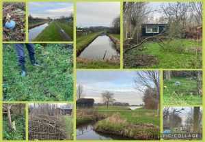 Onze vooruitziende blik bleek te werken want op het complex heerste doodse stilte en het tuinpad was een en al diepe voren in de modder, nauwelijks te lopen. We sprongen van graspol naar graspol, maar af en toe moesten we de schoenen en laarzen lostrekken met zo’n soppend geluid er achteraan. OP het graspad was het al niet veel beter. Het veen veerde daar nog vrolijk terug onder onze tred, maar in de tuin liep je je al snel vast en had het water het grondoppervlak bereikt. Er was een onverwachte gast, die zich moe had neergevleid tot vlak voor het vijvertje. De Fluweelboom van de buurman die op onze grens stond, was ontworteld en lag nu te zieltogen aan mijn kant. Dat wordt een appje aan zijn adres. Voor de rest is het er drijfnat, kaal, en een tikkie troosteloos door de zompige boden. We besloten om terug te lopen aan de andere kant. Die lag iets hoger, maar ook voor hier was het te nat geweest en het veen totaal verzadigd. In de tuin van de achterbuurvrouw stond de grijs/blauwe oude heer de reiger een kostje te verorberen, vermoedelijk een niet te versmaden mol of woelmuis. Je moet wat op zo’n koude winterdag. Hij was niet van plan voor ons op de vlucht te slaan, een eigenzinnig type of gewoon een hongerig exemplaar.