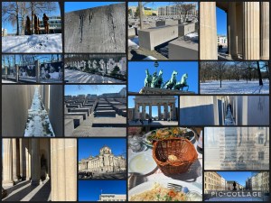 Even daarvoor hadden we het stuk besneeuwde muur gezien met een aangrijpende beeldengroep op de kop, helaas achter tralies maar daardoor wel overdekt met maagdelijke sneeuw. Unter den Linden, Brandenburger Tor, het monument, de Reichstag met het aangrenzende enorme park ‘De Tiergarten’ met zijn monumenten voor de Roma en de Sinti, de Homosexuelen en de gevallenen van de muur, die tevergeefs van Oost naar West wilden vluchten, zorgde voor bezinning en overpeinzingen. De zon maakte dat alles met een diepe laag herdenking in kracht werd gegoten. Historische grond onder de voeten geeft toch een extra dimensie aan het geheel. Hier heeft de tijd geschiedenis geschreven, iets waar de mensheid eigenlijk lering uit had moeten trekken. De teleurstelling ten top van dit moment.