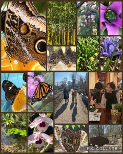 Daarna spoorslags naar dochterlief die met de kinderen een studiedag had en we hadden afgesproken naar de Botanische tuinen te gaan, waar ik de hele winter al naar hunker, maar die pas op 1 maart de deuren hadden geopend. Spoorslags langs het bamboebos naar de vlindertuin. Er vlogen enorme hemelsblauwe morpho’s in grote getale rond, mooie tere glasvlinders en oogverblindende oranje/zwart gestreepte, overal in de kas stonden schoteltjes met fruit waar de soepele vlindertongen zich aan konden laven. Daar, temidden van de schoonheid van plant en dier, zou ik uren kunnen zitten en kijken, en genieten, en kijken en genieten. In de poppenkast hingen reeksen poppen en een aantal vlinders waarvan de vleugels bijna opgedroogd waren, die konden dadelijk gaan uitvliegen. Dartelend vlinderleven, wat een weelde.