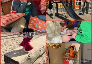 Toen ik aankwam stonden zoonlief en de jongste twee net op het punt om Krummel van school te halen met het idee om nog even op het schoolplein te spelen met zijn vrienden. Het was koud maar omdat de zon volop scheen en al veel warmte gaf, was het er heerlijk. De BSO bleef eveneens, dus konden ze alledrie hun energie kwijt met stoeien en zandbakduiken, rennen en balanceren. Tante Betje had de glijbaan in het vizier. Er waren bankjes voor oma’s die moesten uithijgen. Zoonlief hield alles in de gaten.