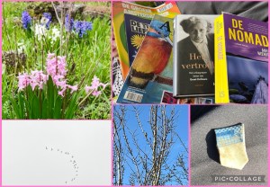 Een zo’n klein moment en we kunnen er weer even tegen. Het laat de mooie kanten van het leven zien. Liefde, een koolmees in een boom, een bloeiende perelaar, twaalf dikke dollie’s (duif) in de boom voor het huis(gisteren), de bloeiende scillae in de Hof, een vlucht aalscholvers in formatie, een scherfje uit het verleden. De kleine dingen, de eenvoud van het leven.