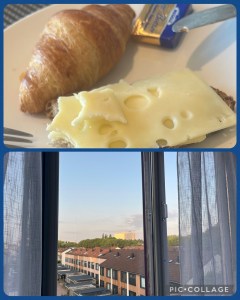 Gelukkig val ik doorgaans daarna in slaap en wordt dan toch verkwikt wakker. Ik lees in de gegevens van het hotel dat het ontbijt op zondag vanaf half zeven wordt geserveerd, dus rond kwart voor acht zit ik aan tafel. Er is breed uitgepakt met allerlei lekkernijen. Niet te geloven. Bij mij gaan dan altijd direct de gedachten uit naar het tijdstip dat het ontbijt is afgelopen. Wat gebeurt er met al die uitgestalde waar. Wordt het aangevuld en de volgende dag weer gebruikt, is het nodig om zoveel luxe uit te stallen. Ikzelf ben sober met mijn ene broodje kaas, een minicroissant met jam en twee koppen capuccino, maar sommige mensen lopen tot wel vier keer toe naar de heerlijkheden toe. Wat ik mis zijn de crackers. Zo’n enorm aanbod en toch nog wat te missen. Ik hoor mijn moeder zeggen: T’is ook nooit goed of het deugt niet.’ En dat kan ik alleen maar beamen. Maar ik heb niet geklaagd en het feit vrouwmoedig gedragen.