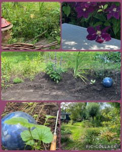 We zwoegen voort tot het tijd is om afscheid te nemen. Ik blijf doorgaan en als ik zoonlief app, waar ik langs zou gaan, blijkt dat maandag beter uitkomt. Dat is fijn. Nu kan ik helemaal los. Als alles zo goed en zo kwaad opgeschoond is, kan de nieuwe aarde erin en de planten. Schop, schep en schepel zijn nodig om de gaten te maken. De stoel voor tussendoor op de plaats rust ook. Zuurstof happen en voort. Rond vieren is de klus geklaard, maar op vrijdagmiddag rond deze tijd zijn de wegen rond Utrecht een bezoeking.