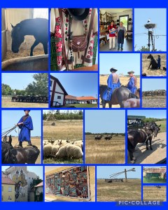 De vlakte was weids en uitgebreid, volop gedorste halmen in mooie schoven opgestapeld. Een kudde waterbuffels in een kraal, een kudde prachtige langhoornschapen en een grote groep semi-wilde paarden. Twee oudere mannen vertoonden eerst hun kunstjes met hun paard en hun in de lucht knallende zwepen, veel geschreeuw en weinig gevaar voor het paard, en daarna bij een volgende halte kwam een jonge durfal in zijn oogverblindende blauwe kostuum vijf paarden mennen, terwijl hij op twee van hen stond.