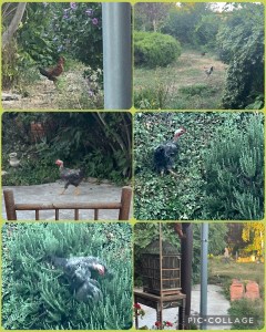 Het avontuur van gisteren kreeg nog een klein staartje, want toen we op het terras aan de dis zaten, hoorden we plots getok, zo’n langgerekte en daarna kort gekloek. We keken in de richting van het prieel en op de utvar liepen twee kippen van de buurvrouw, de wit/zwarte en de bruine, met een air alsof ze wilden zeggen: ‘Ziezo, we hebben onze leefruimte eigenpotig vergroot en zie ons er maar eens af te krijgen’. Waar kwamen ze vandaan? Buurvrouw kwam er al aanlopen toen Lief haar wilde waarschuwen. Door tegen ze te babbelen leidde ze ze naar achter de varkensschuurtjes en daar konden ze met gemak over het hek naar hun eigen verblijf vliegen.