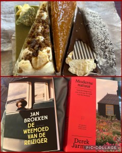 Ze hadden taart meegenomen dat het hotel in Pécs voor hen geregeld had. Echt Hongaarse gebak en dat zag er oogverblindend en kleurrijk uit. Foto van de feestvarkentjes en heel lang bijkletsen, want zo vaak zagen we elkaar niet, onder het genot van een kop thee. Wel fijn dat we een stuk jeugd met elkaar gemeen hadden en de anekdotes waren dan ook niet van de lucht. Dubbel jarig is dubbel bijzonder. Daarna wisselden we cadeautjes uit. Leidse kaas, de enige echte, omdat we acht jaar van ons leven in Leiden hadden gewoond, twee prachtige boeken: ‘Moderne Natuur’ van Derek Jarman, waar het ontstaan van de droomtuin van Jardan, nu een bedevaartsoord, in wordt beschreven met de nodige filosofische gedachten erachter en het boek van Jan Brokken: De Weemoed van de Reiziger voor mij, die altijd heen en weer pendelt tussen hier en daar en het verlangen naar beide plekken van haver tot gort kent, daarnaast gaat het ook over de vele kunstenaars die hij kent. Heerlijke ‘passende’ boeken, zo zorgvuldig uitgekozen dat het daarom alleen al heel wat waard is.