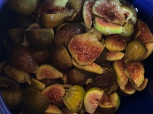 Nog snel de rijpe vijgen geplukt voordat ze voos door de wespen uit de boom op de grond ploffen. Iedere dag een maaltje. Gisteren wilde ik gekarameliseerde vijgen met kip maken, maar door het schilderen, twee doeken afgemaakt en aan het grote doek verder gegaan, was ik eigenlijk te laat en te moe om er nog aan te beginnen. Wel heerlijke gebakken spruiten met ui, paprika en kip en aardappeltjes gemaakt. Zo’n tijd geleden.