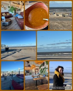 Dus strekte de dag zich in de volle lengte uit en met de koude wind en het heerlijke zonnetje was het een uitgesproken dag om naar het strand te gaan, even de zee te zien en dan de verrichtingen van de uitgelaten honden in het zand te observeren, maar wel achter glas, hoog en droog en lekker warm. We hadden in de vroege ochtend rond een uur of negen ontbeten. Dus in de middag was het wel tijd(en weer) voor een goede lunch. Voor mij een soepje en voor Lief de mosselen. Het was knus in de strandtent en de bediening was uiterst vriendelijk.