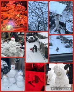 Een serieus pak sneeuw komt er uit de lucht. Foto’s van genietende kleinkinderen met sneeuwpoppen, al dan niet met muts, en sleetje trekkende zoon met de kleine Njong, dik aangekleed, op de rode slee. Alles geniet van dit buitenkansje. Hoe lang is het geleden dat we zo’n dik pak kregen. Broer is met zijn auto en tent aan het winterkamperen in een prachtig ongerept landschap. Met sneeuw is het minder koud, schrijft hij, de sneeuw isoleert. Buiten heb ik hier ook al de eerste sleetjestrekker gespot en die arme krantenman op zijn fietsie, die er toch doorheen moet, of ie wil of niet. Wij blijven binnen, dat is zeker. Misschien dat Lief het er nog op waagt om een wandelingetje te maken.