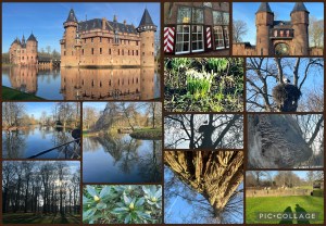 Heerlijke zonnige dagen maken deze winter tot in de puntjes af. Gisteren besloten we voor een wandeling te gaan in het prachtige park achter het kasteel Haarzuilens. Eerst een klein toertje door het aanlokkelijke polderlandschap met haar kneuterige dorpen en haar smalle weggetjes. En daarna in een omtrekkende beweging op ons doel af. De parkeerplaats was goed gevuld. We waren niet bang voor een te grote drukte, die je bijvoorbeeld in Amelisweerd als achterland van Utrecht wel aan zou treffen op dagen als deze, want het park is groot genoeg en dan heb je ook nog de bezoekers, veelal met kinderen, voor het kasteel zelf. We kozen de minst drukke route en genoten van de schoonheid van het slot, de bijgebouwen en de kapel en de verstilde paden langs de waterpartijen, die er veelvuldig aanwezig zijn. Monet-bruggetjes, nog steeds dunne laagjes ijs, gakkende ganzen, overvliegende eenden, het hertenkamp en de volmaakte stilte op een bankje aan het water. De specht verbrak met tussenpozen en een ritmische roffel de serene kalmte en de gifgroene halsbandparkieten lieten ook van zich horen.