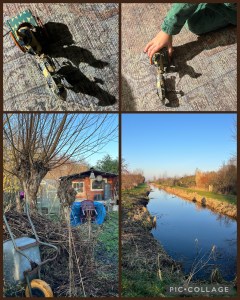 Mijn vergeten snoeischaar hing al twee maanden aan mijn wiedkrukje te wachten en de in de haast achtergelaten vuilniszak aan de achterkant van het atelier stond er nog net zo, maar was wel omgevallen. Het veen om alles heen sopte en slurpte onze schoenen gretig op. Het was een drijfnatte bedoening. Van de week gaat het vriezen en dan wordt het vast beter begaanbaar. De zagen lagen niet in het schuurtje, maar in het huisje van dochterlief. Het scherpe kleintje en de handige Japanse zaag met steel voor het wat hogere werk. De zon had er ook vandaag zin in, dus was het uitstekend weer om aan het werk te gaan. Ik begon met het afgrazen van de oude takkenril. Dat kon niet snel, want er mochten geen vuurtjes meer gemaakt worden en alles moest worden afgevoerd in plastic zakken. Daarvoor moest ik de takken in kleinere stukken breken. Het hout was al vermolmd, dus dat was geen probleem op enkele knoesten na. De takken die van afgelopen jaar waren konden op de takkenril die grensde aan onze tuin en die van de achterbuuf.
