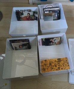 Foto’s uitzoeken, verdelen in zes stapels, naam erop, straks jaartallen erbij en voor ieder een bak maken, als in de kaartenbakken van vroeger. Het doet me denken aan bibliotheek spelen met mijn zussen. We hadden in een hoek van de kaft van de boeken driehoeken geplakt, briefjes met de datum erop erin geschoven en bij het uitlenen kwam er een nieuwe datum bij. Liever hadden we dat met echte stempels gedaan, maar die hadden we nou eenmaal niet en wie niet sterk is moet slim zijn.