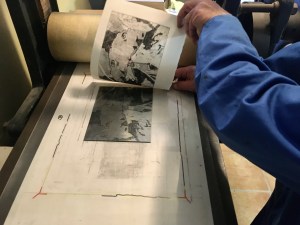 Daarna vloog de tijd, zoals zo vaak als concentratie een grote rol speelt. Het was een grote zinkplaat en als ik het af wilde hebben, was het gestage tempo allesbepalend. Eigenlijk was er nauwelijks tijd voor de ingelaste pauzes. Vriendin was met haar geëtste bootjes aan het experimenteren geslagen met aquarelverf en half afgeslagen platen, zodat sommige afdrukken dreigende lucht vertoonde of een vrolijke noot kreeg door de kleuren.