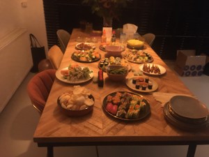 Zoonlief had voor allen sushi gehaald. De tafel stond ruimschoots vol met heerlijkheden. Er was ook nasi kuning en saté. Verbazingwekkend hoe het bijna helemaal opging. Ondertussen werden de kinderen, met hun buikjes rond, vermaakt door oom, die drukker dan druk een imitatie gaf van de gruffalo, waarop de kinderen gillend een verstopplek probeerden te vinden achter de gordijnen.