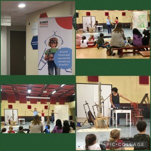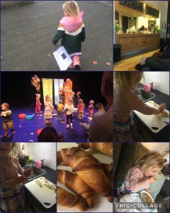 Kleindochter aarzelde, maar van lieverlee naderde ze het podium met voorzichtige stappen, al hield ze de vluchtroute goed in de gaten. Aan het eind van de voorstelling was ze helemaal los en met een buit van uitgedeelde papiertjes, kleurrijk en goed te gebruiken voor het knutselen, togen we na de koffie, thee en ranja naar ons huis, waar we de croissantjes zouden bakken.