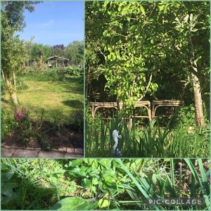 Toen we er klaar mee waren, de armen rood van de per ongeluk opgelopen steeksels, was de voldoening helemaal groot. Ziezo weer een stuk van de tuin gereed. Lief had de grond onder de vruchtbomen aangepakt en daar was een lieflijke plek voor het bankje van de drie stoelen ontstaan. De twee stoelen die er stonden gingen naar de andere kant aan het begin van de schaduwtuin. Af en toe stopten we even om bij te komen op het terras en te genieten van de vorderingen. Nog maar anderhalf bed te gaan.