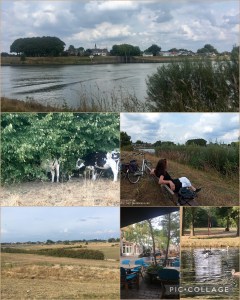 Een weggetje achter het klaphek leidde ons langs de koeien die onder de bomen wat verkoeling zochten naar het bankje, dat er nog altijd stond. Maar…Er groeiden wilgen en kreupelhout voor die het uitzicht benamen. Als je op het bankje zat, was er nu alleen een muur van groen en uitgebloeide kattenstaarten. Gelukkig was er verderop een open plek. Daar lag het lieflijke stadje in volle glorie. Er heerste volmaakte stilte, die alleen verstoord werd als er een waterscooter langs scheurde die met het toenemen van de snelheid ook de decibellen opvoerde.We namen foto’s bij de open plek, bijna hetzelfde stuk grond waar eeuwen geleden kunstenaars hadden gestaan om die overkant in tekening of lijnets te vereeuwigen..