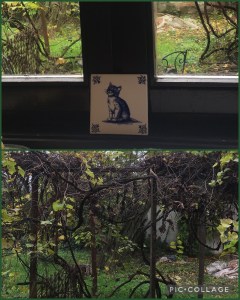Pluis kijkt de keuken in vanuit haar plaatsje voor het raam. Onze enige echte zit natuurlijk thuis bij zoonlief, maar van mijn lieve vriendin kreeg ik met mijn verjaardag een schattig Delfts Blauw tegeltje met een kleine poes erop, die vragend omhoog kijkt. ‘Dan is Pluis er ook een beetje bij daar in Verweggistan’, waren haar woorden die het presentje vergezelden. Nu staat ze hier mooi te zijn in een omlijsting van de oude stammen van de druiven tegen het vervallen prieel op, met nog wat verschrompelde druiventrossen en de herfstige, sterk uitgedunde bladerpracht en brengt niet alleen die lieverd in gedachten, maar ook vriendinlief zelf is er daardoor bij. Twee vliegen in een klap.