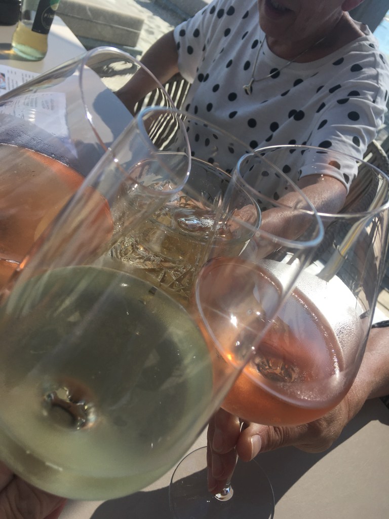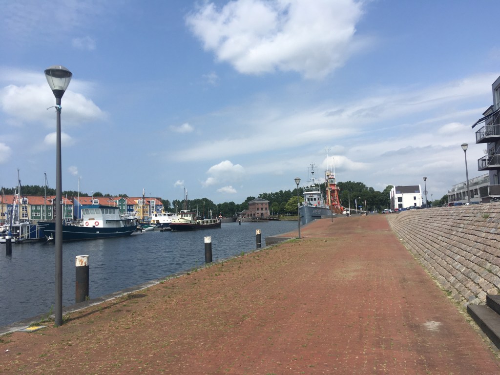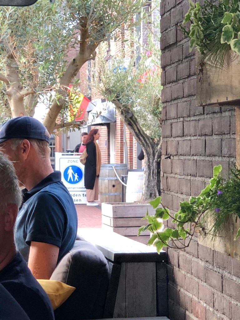 Een haveninham verder liet een vrouw haar oude schnautzer uit in het water en aan het einde lag een klein verwant verloren eilandcafé met gesloten terras, middenin. Daarna waaierde het breed uit in het Haringvliet. Een mooie oude draaibrug verder was een terras opengesteld op de punt met uitzicht over haven en sluis en daar, vanaf de hoge krukken, bleek eerst koffie en daarna lunch een goed idee.