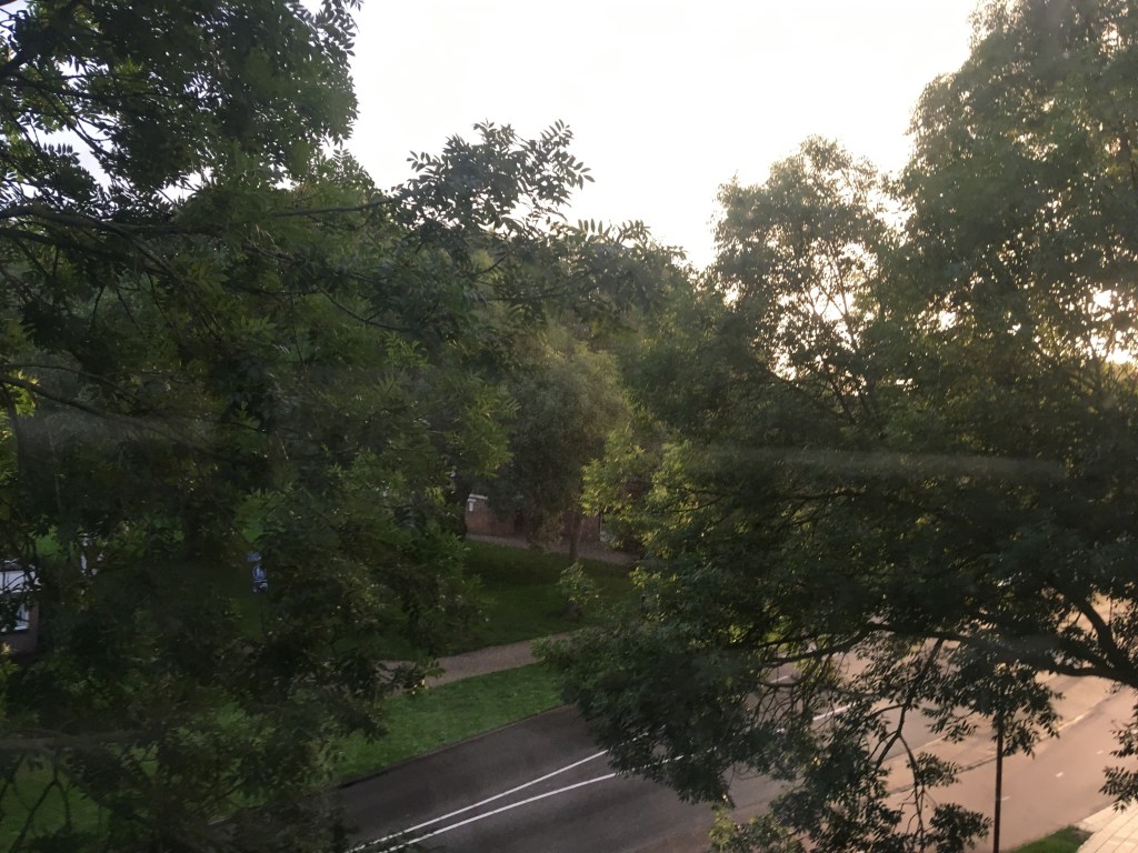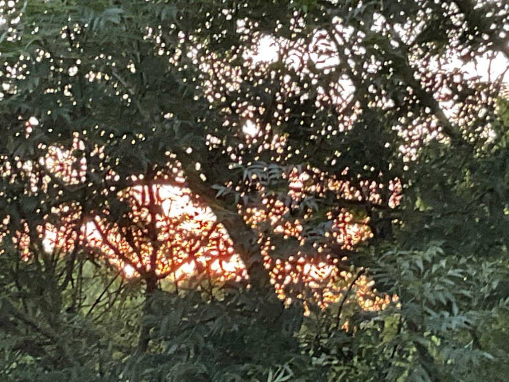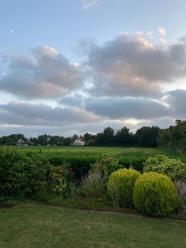 Bij thuiskomst een lichte noedelsoep van de hand van zuslief en nog een avondwandeling, met recht een blokje om te noemen, in een inmiddels weer verfrissende temperatuur. Het leverde een nieuw te ontdekken natuurgebied op, vlak om de hoek. Dat was voor later om te ontginnen. Terwijl ik op huis aan ging, het hek het af liet weten en de beide zussen het bungalowpark gingen verkennen, kleurde de zon de wereld met rozerode sluiering.