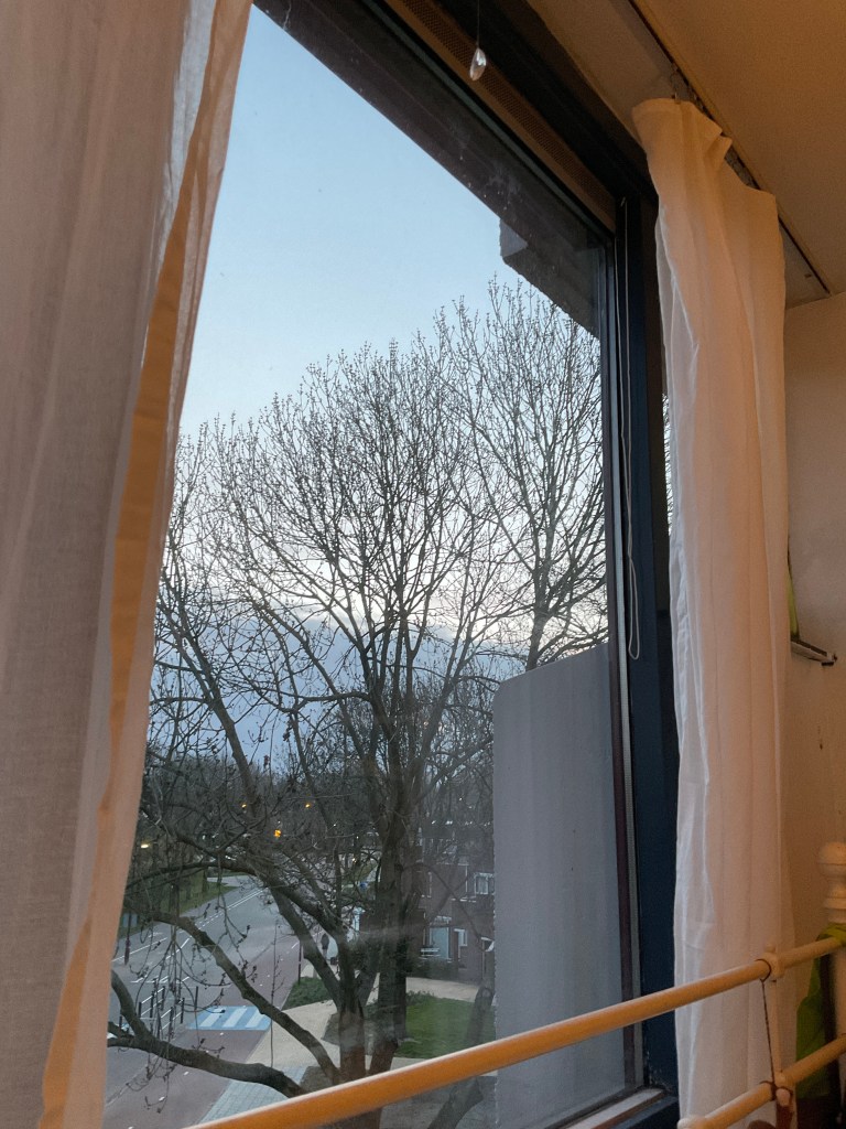 Alle parkeerplaatsen waren vol, op het gras nog één plekje voor de kleine Blauwe. Er hingen viooltjes aan het hek van de overleden tuinder en een briefje erbij van de familie, met een foto van dat lachende vertrouwde gezicht naast de stok met de zwarte vlag. Met de hand op het hart een groet in gedachten. Aan alle kanten was er een warm onthaal, een zwaai met een arm, een knik met het hoofd, een uitbundig hallo. De buuf van twee tuinen achter me kwam me achterop fietsen, al ingeënt en een pak aan bezwaard gemoed armer. Het voelt als een bevrijding, zei ze en ik kon me er alles bij voorstellen. Over het bruggetje splitsten onze wegen zich weer. Bij de tuin oogde het gras verwijtend lang, terwijl ik mompelend beloofde er vandaag een fris geschoren tapijtje van te maken. Om dat waar te kunnen maken pakte ik als eerste de maaier eruit en zette hem pontificaal voor miijn neus. Zo kon ik er niet meer om heen.