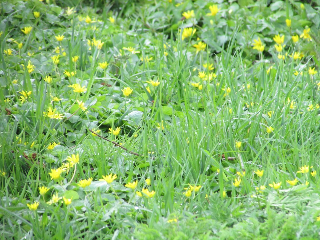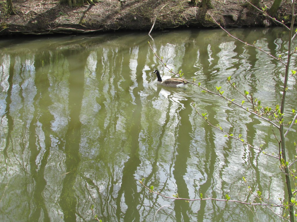Ineens viel mijn oog op de eend met haar kroost. Als een kluitje zwommen de pulletjes achter het grote beschermende moederlijf aan. Het beeld met de grazende schapen op de achtergrond oogde helemaal lente. Er misten alleen nog een paar dartelende lammetjes. Maar ja, zonder ram tussen de ooien is dat gegeven mijl op zeven.