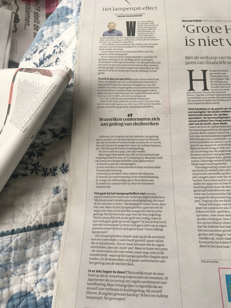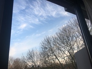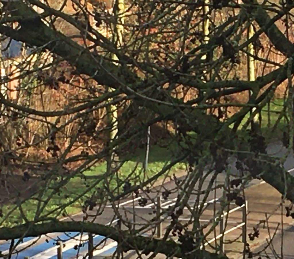 Die gedachte is goed voor een ononderbroken slaap van drie uur met als beloning de zon, die krachtig onderstreept wat ik in de late nacht voorbij zag komen. Een koolmezenpaar viert het feest mee in de boom voor het raam. Te kwiek voor de foto. Wat rest is slechts de boom.