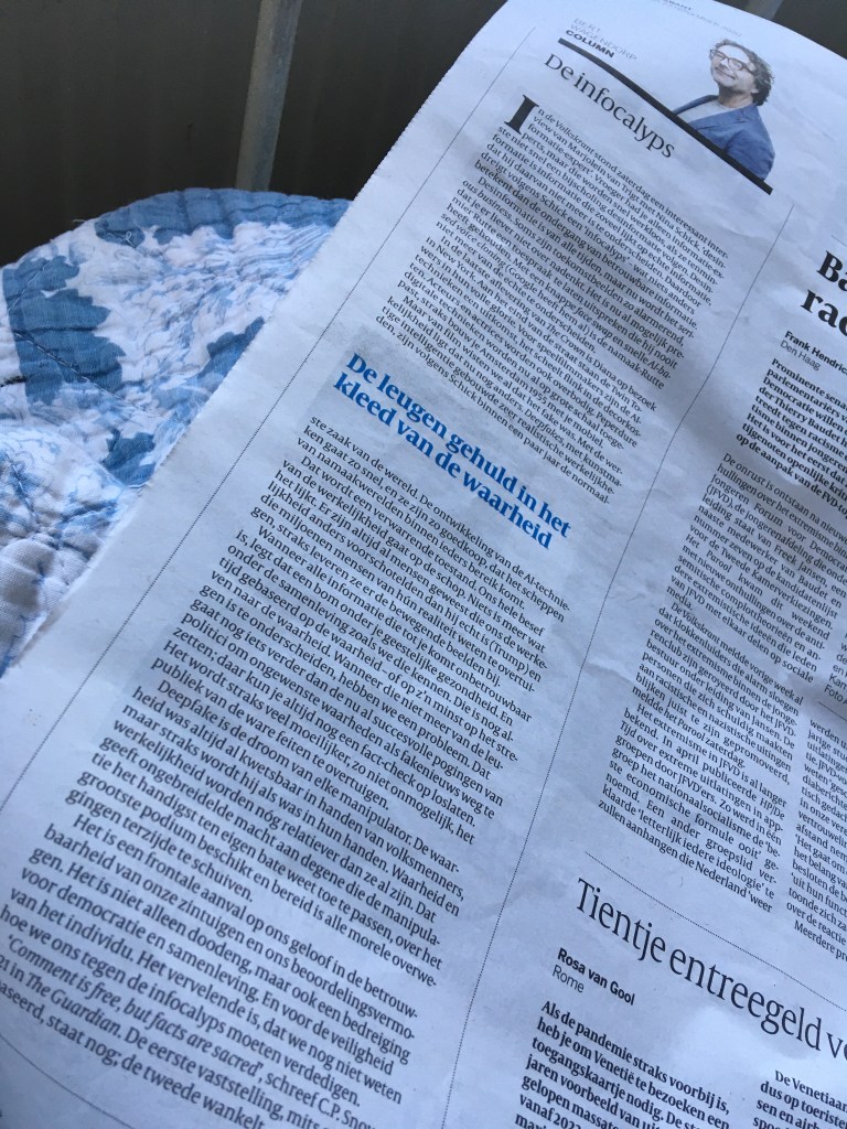 Met een geknapte knie is er eenvoudigweg teveel tijd en maalt het hoofd haar spinsels bij elkaar. Halve ochtend op bed met kussen onder de knie, later op de bank met kussen onder de knie, af en toe rondjes lopen of lichte oefeningen. Zodra dat gebeurt, wringt het gedachtegoed zich in allerlei bochten en puzzelt en memoreert, staat ondersteboven of schiet met een uppercut van rechts en naar links. Ontembaar, zo’n brein. Helaas, pindakaas werd de afspraak met mijn oude kleuterkweekvriendinnen noodgedwongen afgezegd. Daar zou die armlastige knie een flink aantal kilometers voor moeten gassen en dat dorst het brein weer niet aan. Spijtig maar niet onoverkomelijk. De afspraak blijft staan voor het begin van de volgende maand.