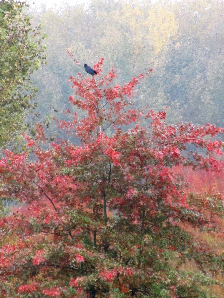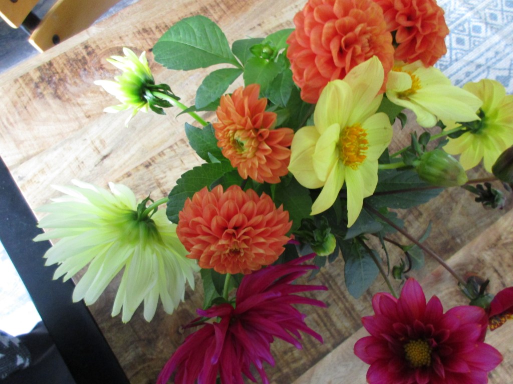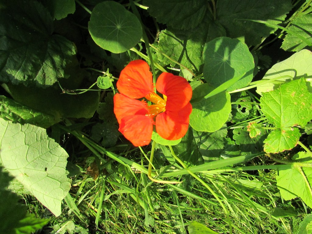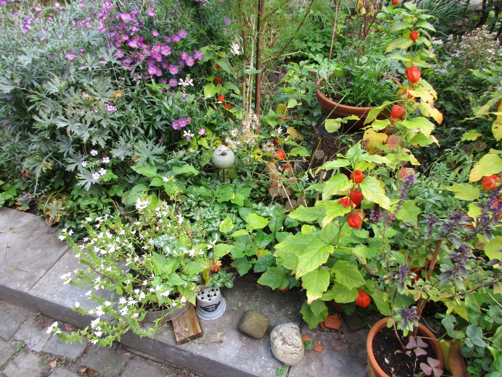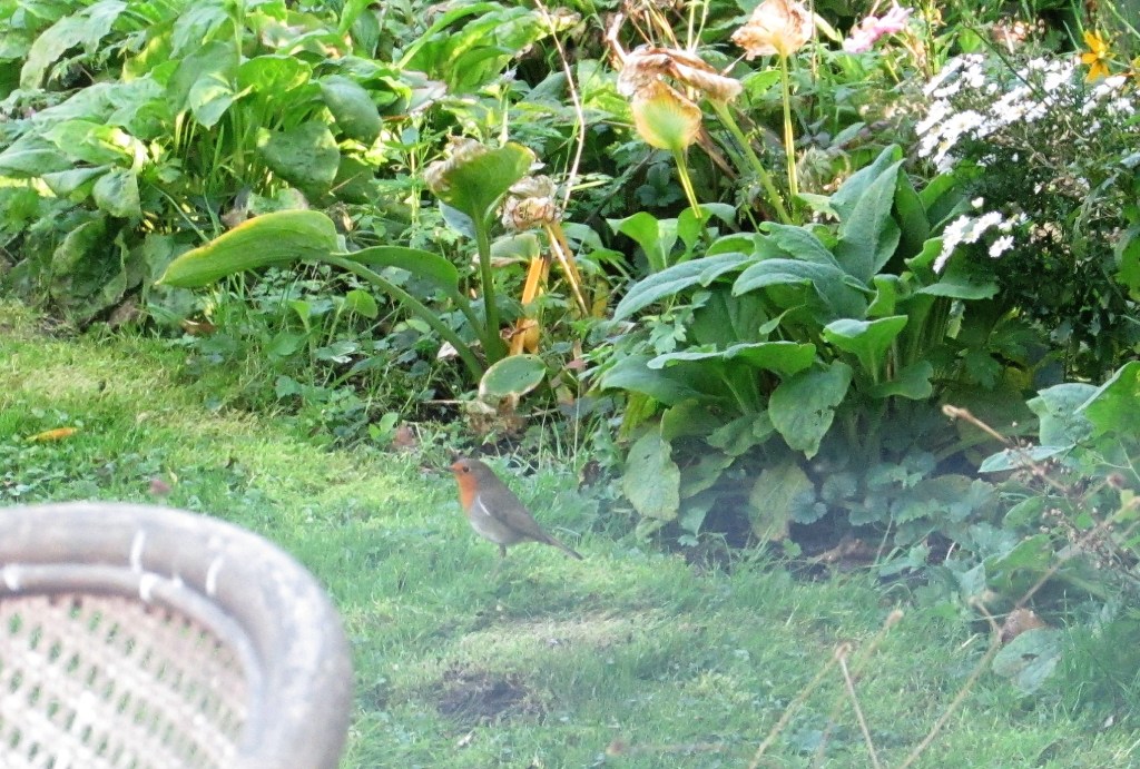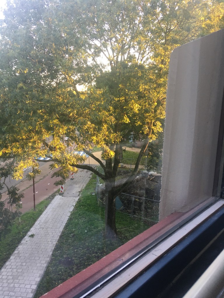 De vesting van vier trappen beklommen en de gebruikelijke observatiepost bij het bovenkomen bereikt. Adem moet stromen. Na de trappen deed het dat niet. Het vreemde vogelgeluid bleek het gepiep van de tegelsnijder te zijn. Zon op de bladeren en de balkondeuren even open. Wat ‘binnenzit’-warmte eruit.