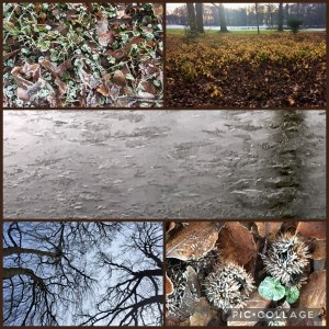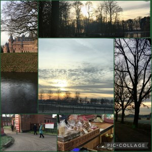 Een klein rondje over het landgoed, een groet aan de geitjes, waarbij de enige witte dacht een kans te wagen toen het hekje open bleef staan. In een wolkje boven zijn hoofd stond geschreven ‘ Een raam naar de vrijheid’ en hij voegde de daad bij het woord door hard op de opening af te stormen. Net op tijd deed zus van schoondochter het hek weer dicht. Angstig vloog kleindochter, bij het zien van die opvliegende baal witte wolligheid, achter mijn benen. Het hield op met zachtjes regenen en nu vielen zware druppels loodrecht naar beneden. Maar als vrouwen van stavast lieten we ons niet van de wijs brengen. Sjaals over het hoofd en dwars door het bos, waar de bomen nog enigszins beschutting boden.