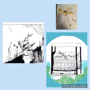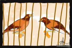 Daarna weer op huis aan, waar zoonlief zijn weekdieet stond klaar te maken. Tijd om even nergens aan te denken met Masterchef Austalie als onschuldig vermaak. De opdracht voor #inktober van vandaag was ‘Stuck’. De ergste vorm van ‘Stuck’, vogels in een kooitje die niets liever willen, dan vrij zijn, twee treurspreeuwen, leken me de juiste verbeelding. ‘Free as a bird’. Wie wil het niet.