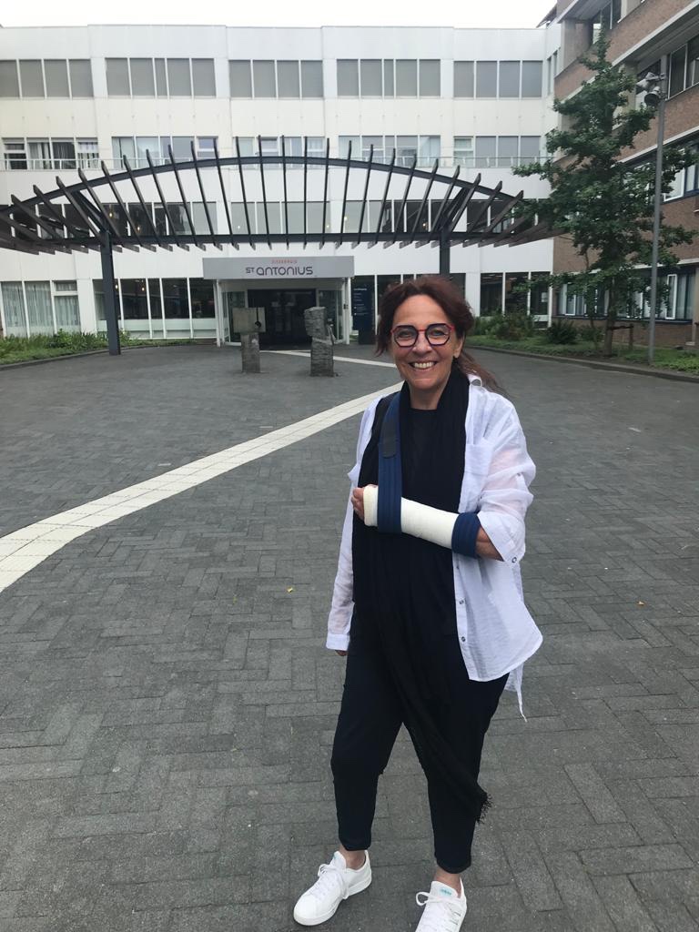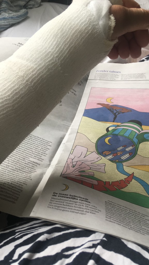 Het is goed te doen, lezen en fietsen, kan ik jullie vertellen. Alleen…niet met een gipsen pootje, of je moet het stuur los laten. De breuk zit precies daar, waar de knik gemaakt wordt en het handvat in de greep houden geeft pijn. Een en een is twee, geen goed idee derhalve.