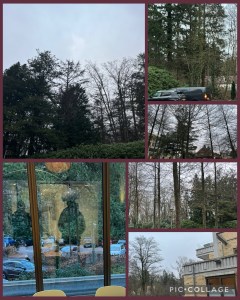Het ochtendzonnetje had plaats gemaakt voor een druilerige regen, maar dat mocht de pet niet kreuken. Truus plenste er lustig op los met haar driftige ruitenwissers. Het is een mooi complex, vergeleken bij het vorige huis ook heerlijk rustig. Geen rondweg vlak naast het balkon maar zicht op twee hele oude grillige berken daar en op de uitnodigende bossen door ieder vensterraam.
